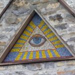 On either side of these columns are two clasped hands with a pyramid above them that symbolizes unity among Masons. Therefore on each side there’s an eye in a triangle surrounded by rays emanating from it – this symbolizes divine providence watching over all Masons from above.